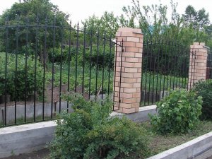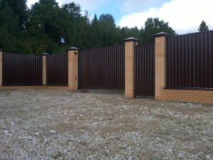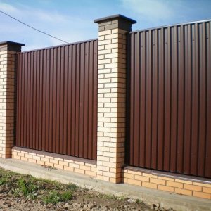Данный металлический забор представляет собой ограждения, выполненные в виде готовых секций, с опорами или без, соединённых между собой. Этот способ очень надежный, также выглядит очень эстетично. Кирпич можно подобрать по цыету. Стоит еще сказать о жесткости этого забора, она на высшем уровне.